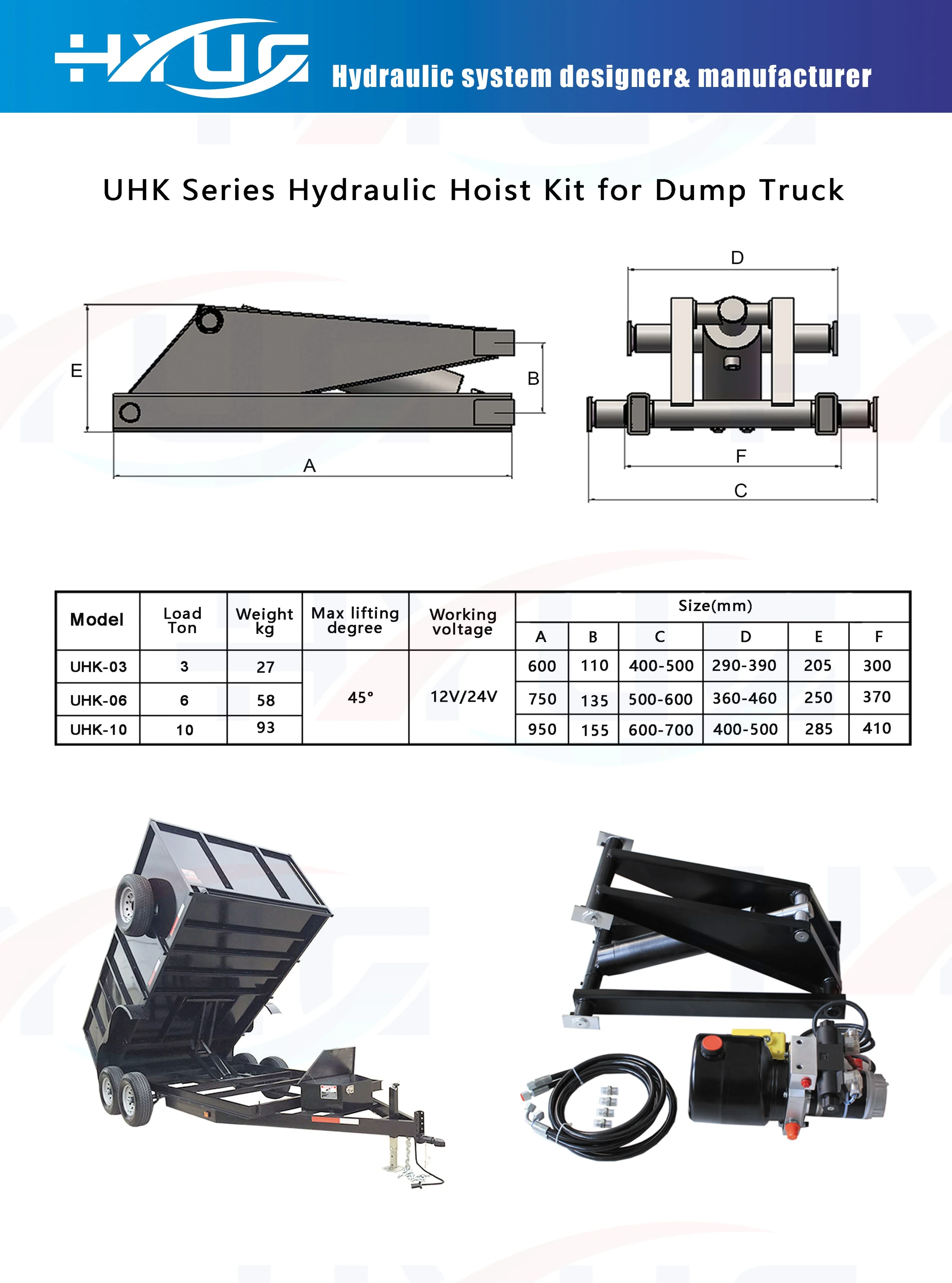 Application: Tipper trailer, dump truck etc. Load capacity: 1-10 tons Complete kit including 1 set hoist frame, 1 pc hydraulic cylinder, 1 set hydraulic power unit, 2 pcs hoses and connectors.